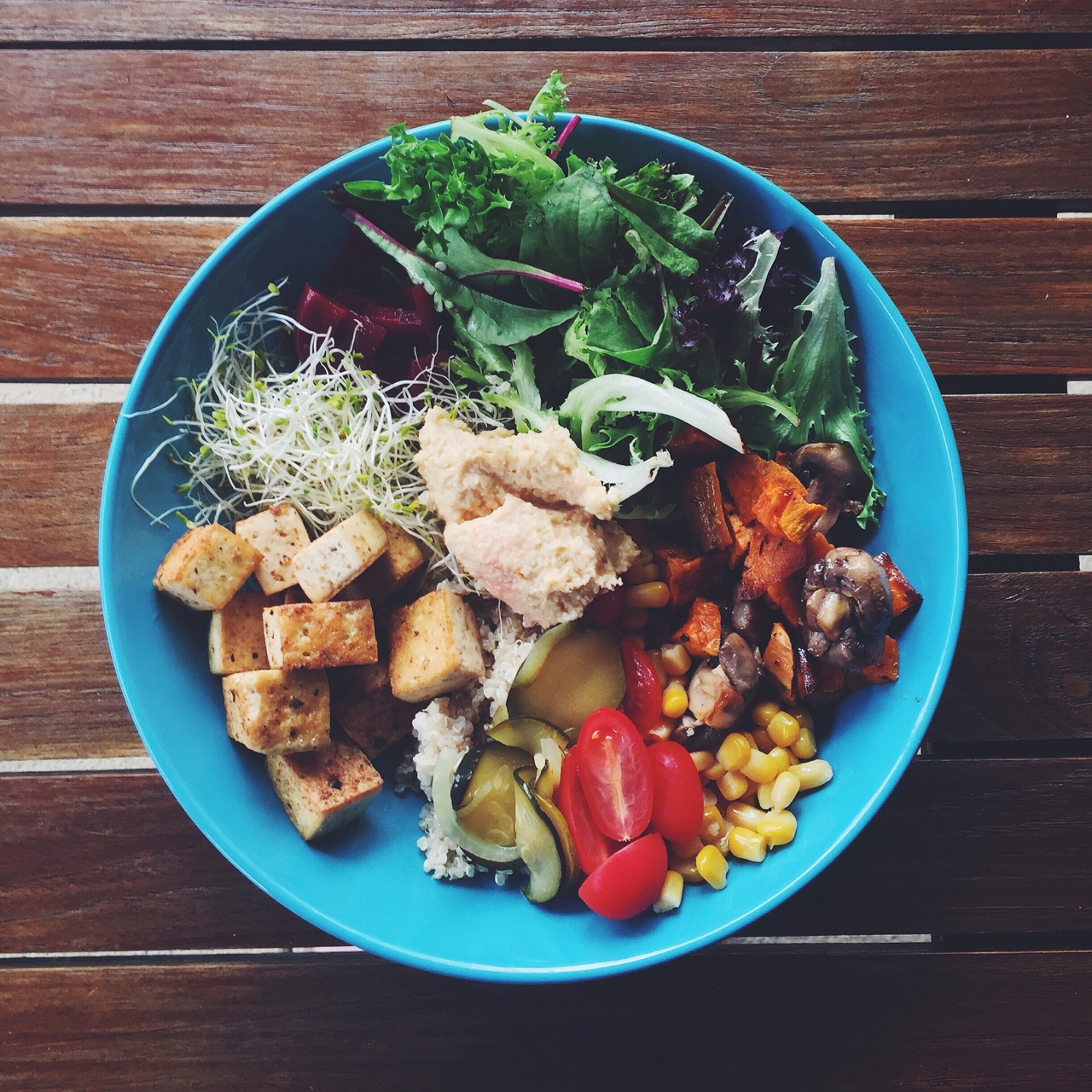 I’d happily keep preparing and eating these forever <3 Quinoa with tahini and apple cider vinegar, lettuce, cherry tomatoes, semi-sundried tomatoes, green olives, beetroot, corn, sprouts, baked sweet potato, sautéed salt and pepper mushrooms, grilled cajun tofu, pickled zucchini and homemade hummus.
