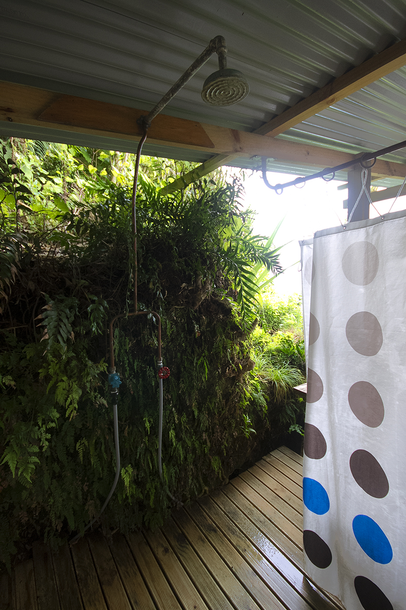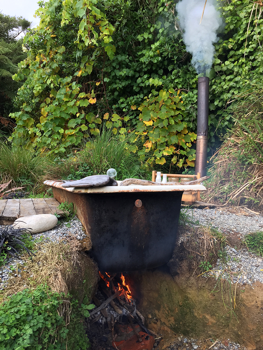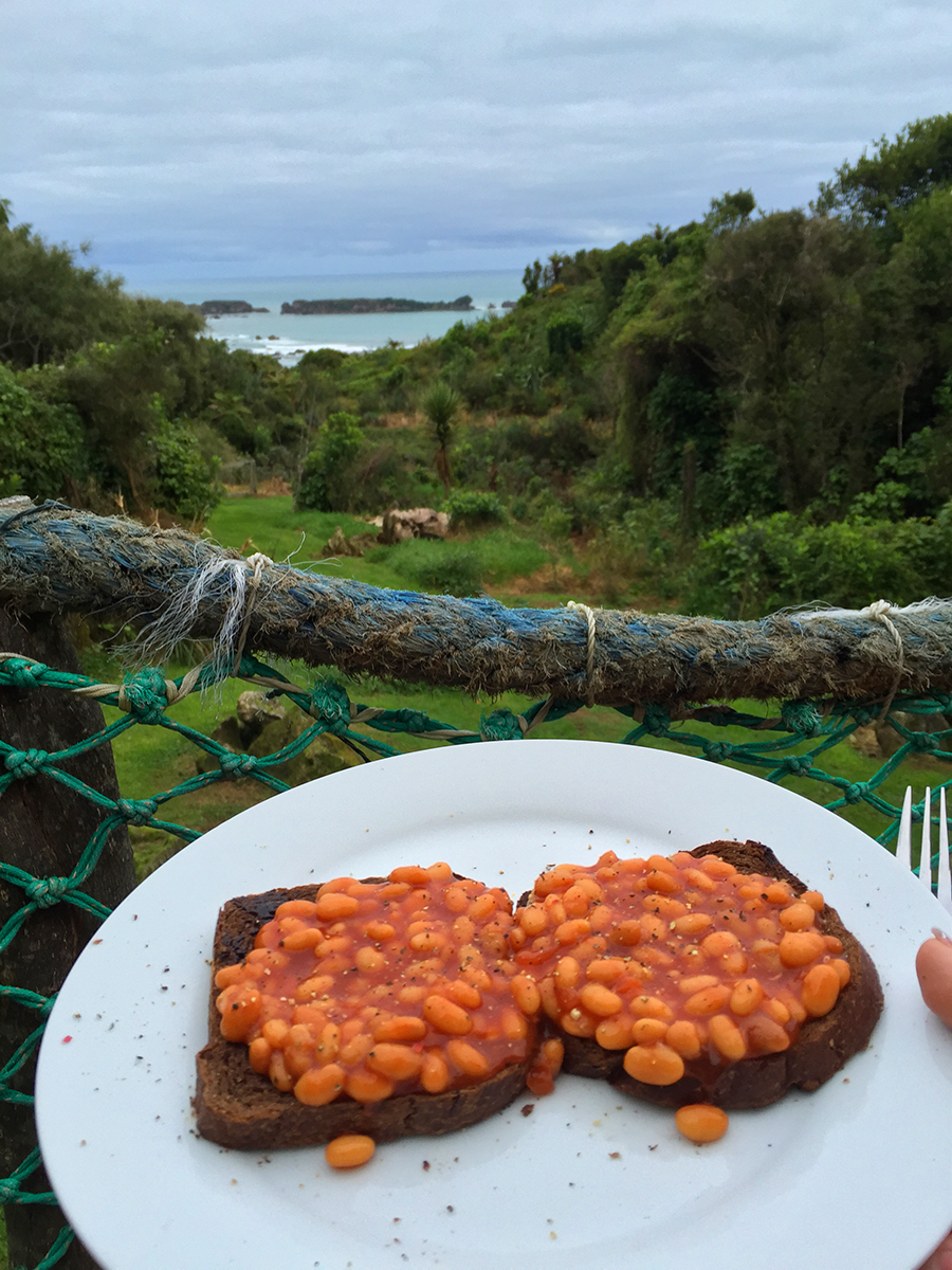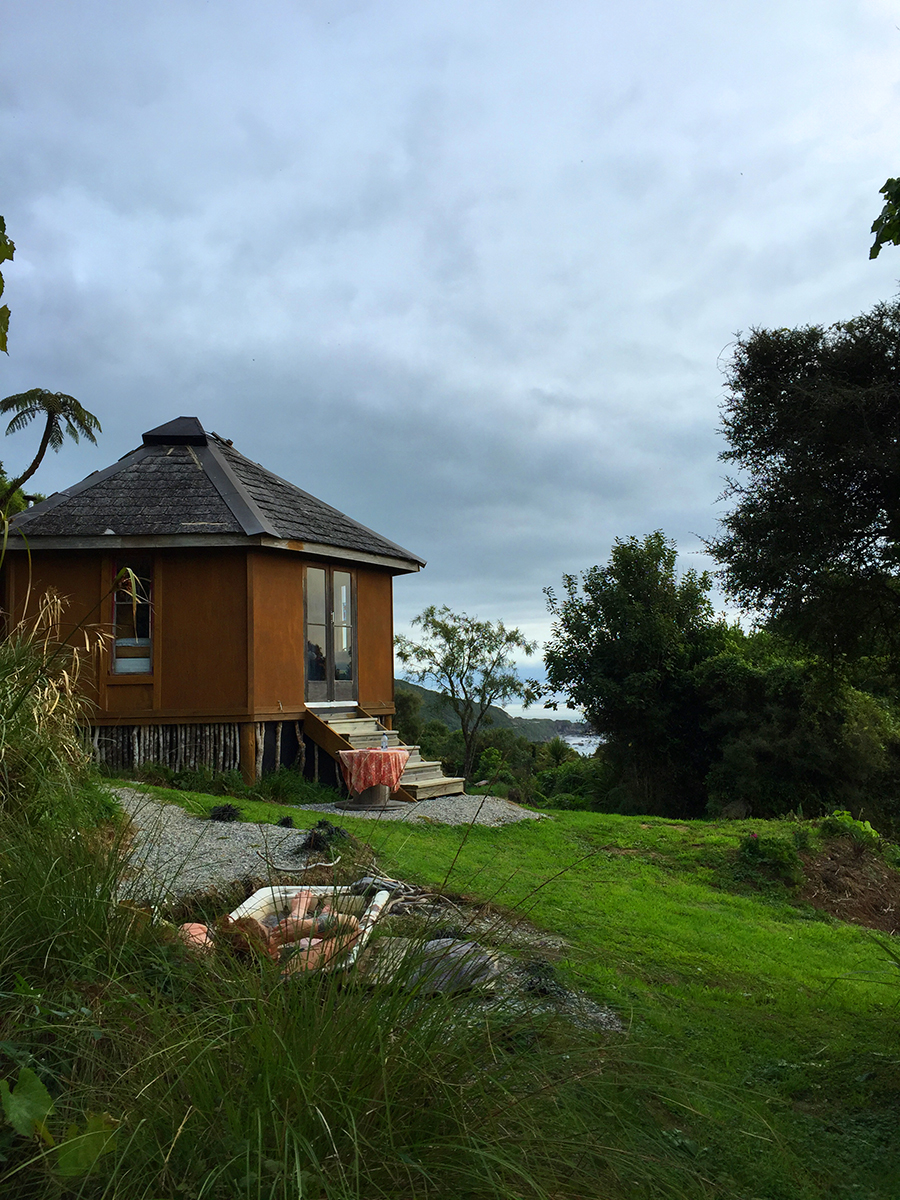 Boy oh boy did we pick well. The Hexagon is an off the grid eco cabin with solar power for basic essentials, an outdoor kitchen (the most fun kitchen I have ever cooked in, ever!) and bathroom and outdoor fire bath. The cabin has stunning ocean views and is nestled in a lush green haven on the private property of an old hippy commune from the 70s, now under the care of local artist, handyman and all-round legend, Jed. Surrounded by feijoa trees and cheeky weka birds, the two nights we spent here were completely and utterly peaceful. The cabin itself and all of its perks are made from recycled and local materials, everything from the beautiful timber benches to the vintage copper showerhead and the second-hand rope net sealing off the front balcony. There’s no wifi, no phone reception, no television. It is the perfect escape from the noise and ever present connectedness of our seemingly disconnected modern lives. I spent almost two whole days reading by the outdoor fire and sipping tea and it was entirely perfect.